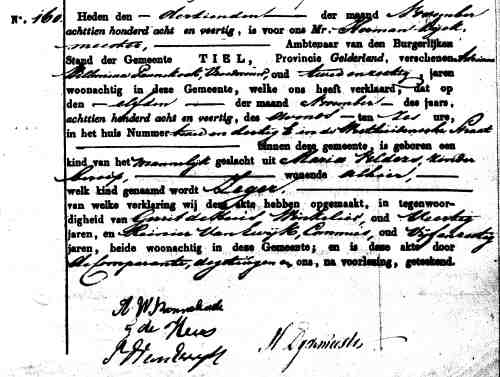 2 Geboorteakte, Gelders Archief te Arnhem, BS Geboorte Burgerlijke stand Gelderland, dubbelen, Tiel, archief 207, inventarisnummer 1406, 13-11-1848, Tiel, aktenummer 160. Citatie datum: 23 Mrt 2021.